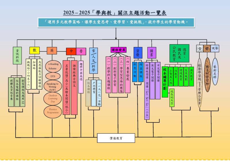 | 教學活動: | 以單元教學、專題研習、跨學科學習活動及全方位學習活動提升學生的高思維能力、創造力及多元智能。 |